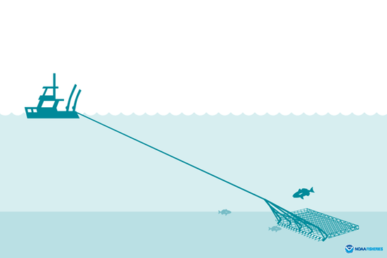 The methods used to catch such large amounts of fish are extremely harmful to the ecosystem. Dredging and Bottom Trawl are the most ecologically damaging to the environment, and also happen to be the most common techniques used. These techniques use either a bar with teeth or a large mesh bag that is scraped along the sea floor and dislodges shellfish along with harming other sea life in the process. It has a very large impact on bycatch and seabed damage.